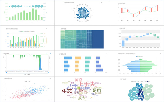 - 數(shù)十種的可視化圖表效果,包括柱形圖、折線圖、雷達(dá)圖、散點(diǎn)圖和詞云圖等,滿足不同人群的閱讀偏好,為您展示多樣數(shù)據(jù)信息提供全面支持