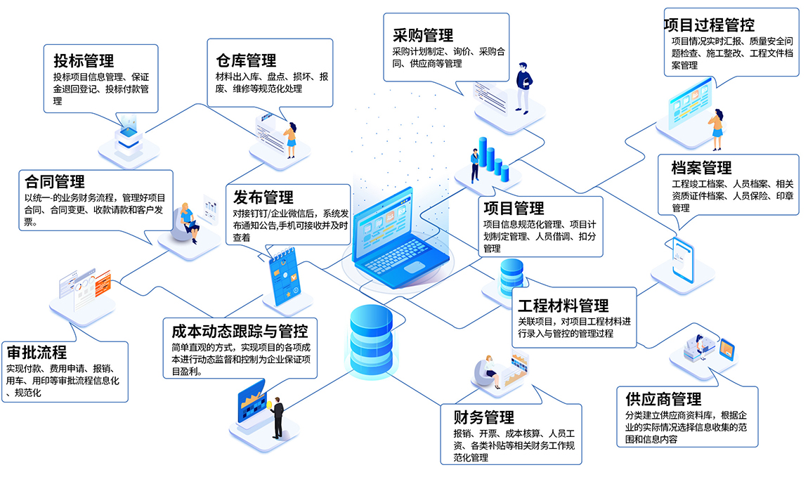 數(shù)字化管理系統(tǒng)對企業(yè)工程項目從項目投標中標、項目過程管理、合同管理、物資設備管理、采購管理、項目過程管理、施工隊管理、供應商、成本核算等進行全面綜合管理;縱向貫穿投標、采購、施工、竣工的全過程,橫向涉及公司內部的各相關崗位,是一套全方位、集成的企業(yè)項目綜合管理平臺。通過對成本、進度、質量、安全等方面的控制,以及對合同、結算、支付、資金等要素的管理,來提高工程類企業(yè)對工程項目的綜合配套能力。